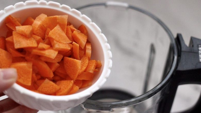 4. 破壁机杯子里,先倒入胡萝卜片。