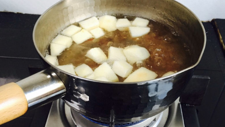 6. 锅中加入600ml饮用水大火烧开倒入桃胶盖上锅盖大火煮开转中小火煮30分钟
