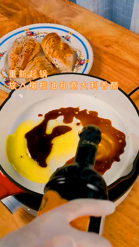 5. 加热锅具,放入橄榄油,油热后放入鸡胸肉,取出装盘备用