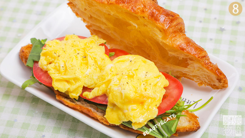 9. 香肠炒蛋可颂三明治就做好啦,搭配一杯热牛奶就可以开吃啦~