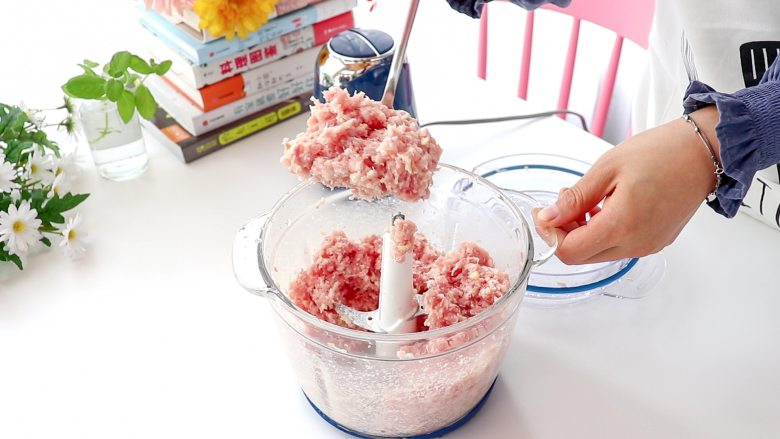 4. 猪肉切块放入绞肉机中,加几片姜片