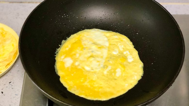 7. 把鸡蛋打散,锅里刷一层油,烧热后,倒入适量鸡蛋液,摊成圆形的蛋皮,两面煎熟,用小火慢煎,避免过焦,蛋皮不要太大,直径约16厘米。也不要太薄,避免包饭的时候破裂。
