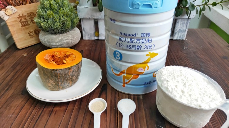 4. 蒸熟的南瓜放凉后加入两勺奶粉。