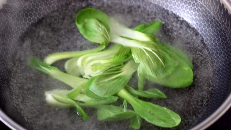 13. 另起锅倒入适量的清水煮沸,加入少许盐和几滴花生油,放入青菜煮至变色断生的时候,捞出沥干水分。