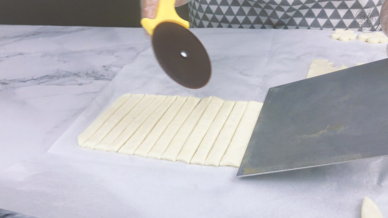 15. 将盖花朵形状剩余的面团,再压成面片。并切成均匀条状。