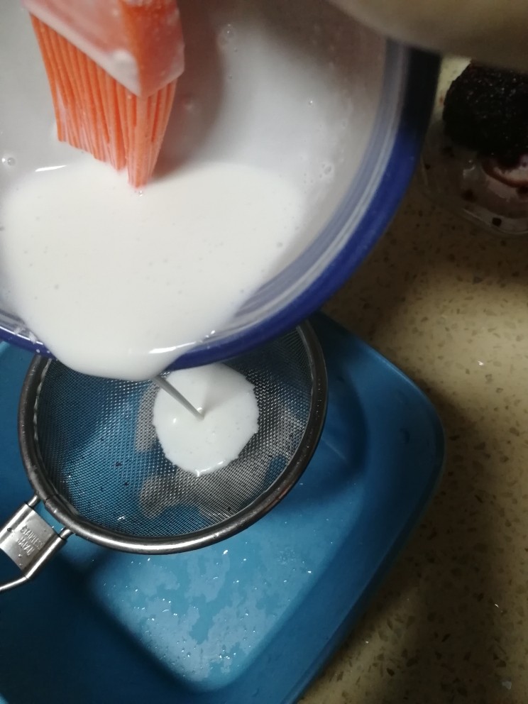 14. 把椰汁糊倒入熟的桑椹膏上面