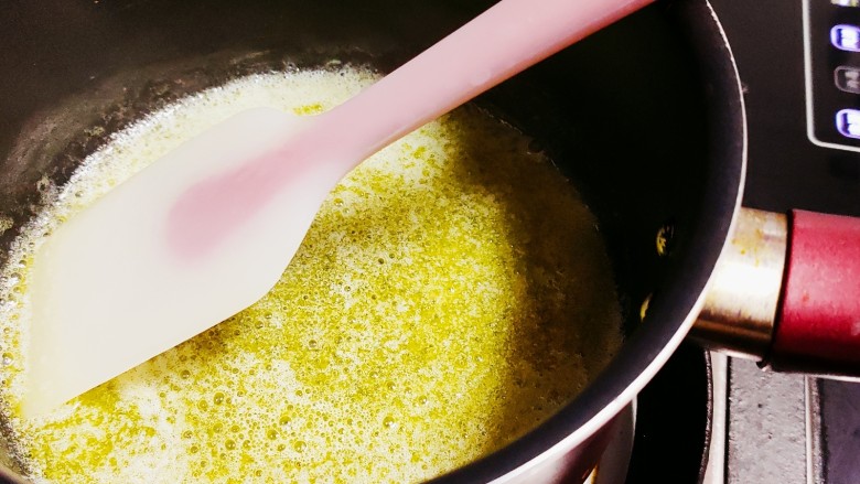 7. 将黄油倒入奶锅中,小火加热