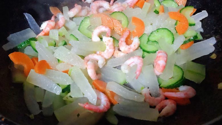 8. 放入黄瓜、胡萝卜、虾仁翻炒均匀