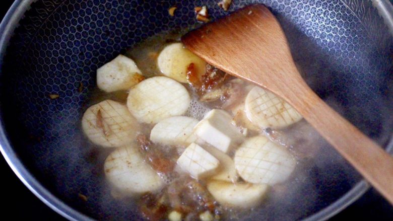5. 放入浸泡好的虾干,小火慢慢煎出虾油。