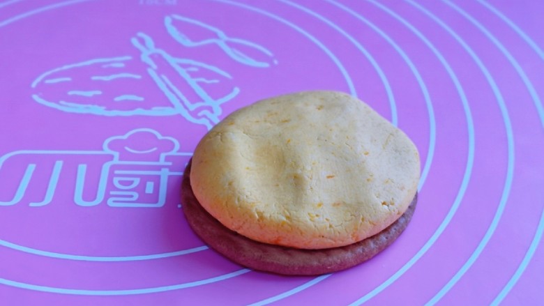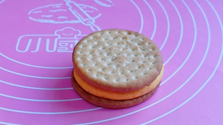 7. 取一块饼干,南瓜面团用掌心轻轻压扁,放在饼干上,压制与饼干同样大小即可。