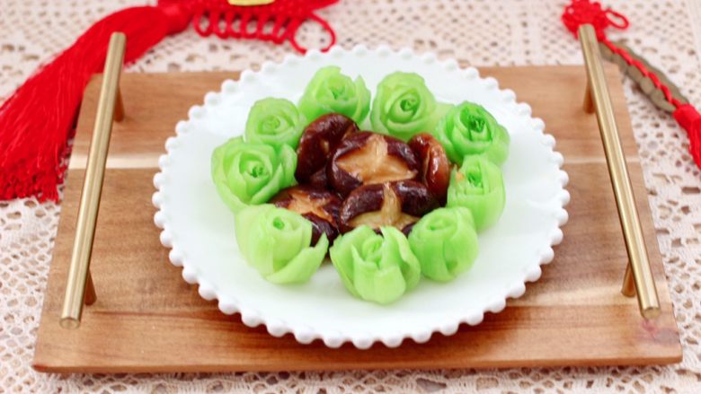12. 把焯过水的油菜切出叶子不用,用油菜头摆盘,上面摆上做好的香菇就可以了。