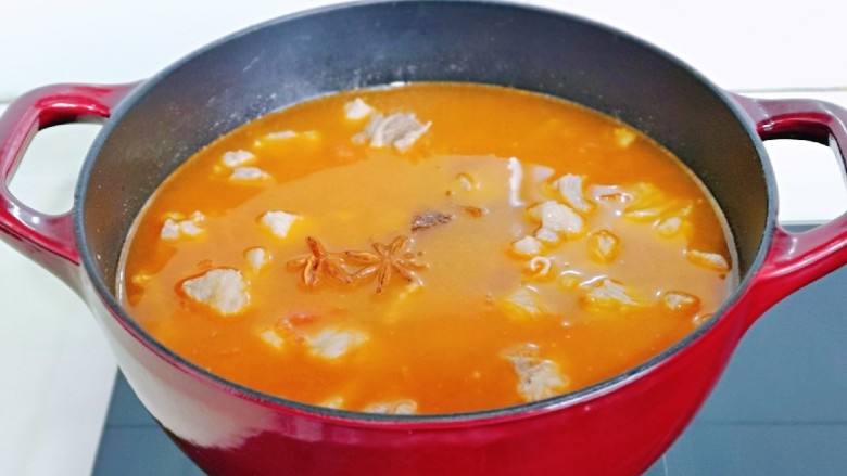 12. 盖上珐琅铸铁锅盖子大火烧开,转小火慢炖40分钟。(时间可以根据个人喜欢的口感增减)