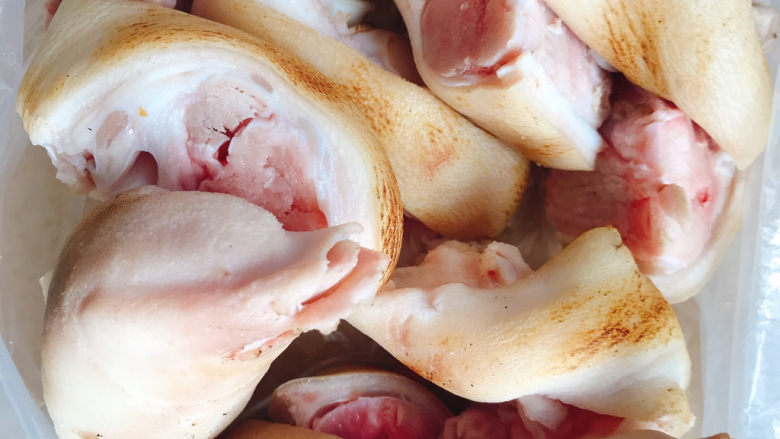 2. 猪蹄拔毛后用火烧一下,冲洗干净