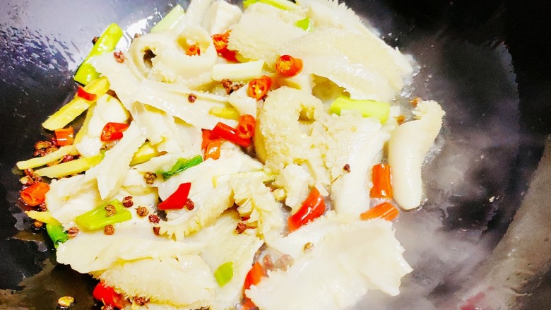 10. 加入辣椒,盐和鸡精,生抽及少量水,翻炒,直至辣椒炒熟