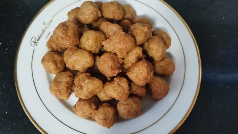 13. 热锅冷油,油温五成热放入肉丸炸,用小火炸