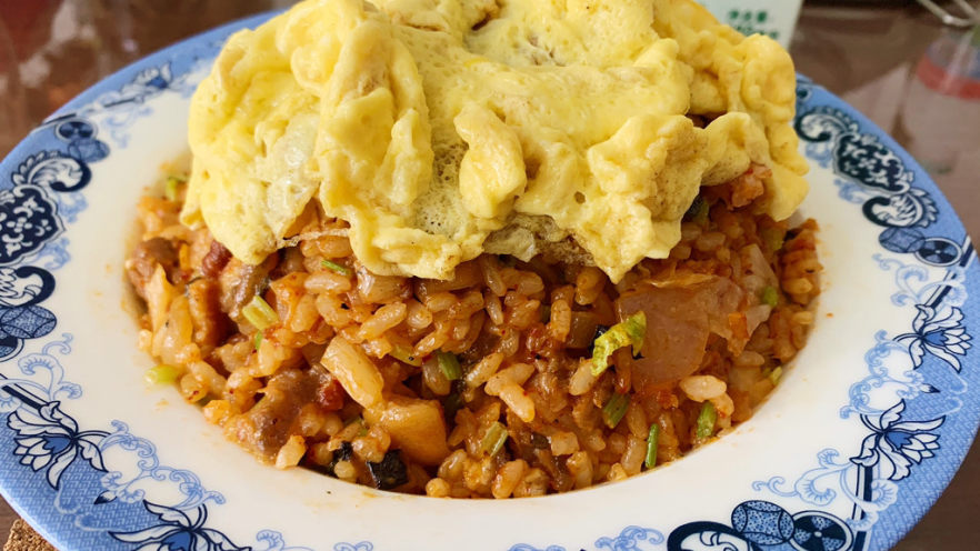 10. 蛋忘记拍照了,锅里倒油,油7成热的时候关小火,倒入蛋液,等蛋液半凝固时用筷子拨一下,让后关火附在炒饭上