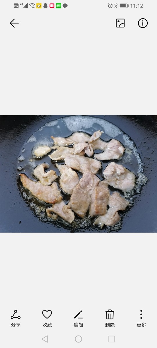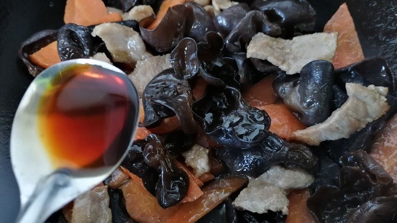 14. 放入肉片一同翻炒,加入一勺生抽提味