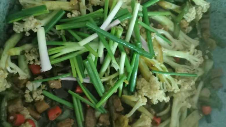 10. 下花菜翻炒,如果想快速或者吃软一点的花菜,可以提前把花菜焯水