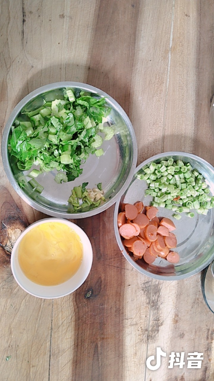 4. 第四步:洗干净的蔬菜切好备用,鸡蛋打入碗中,放适量盐