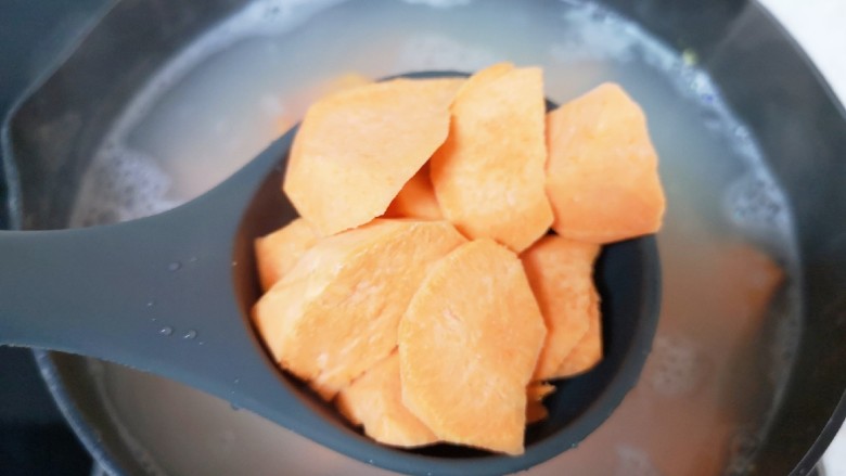 4. 锅开以后下入红薯,再次烧开以后转小火熬半个小时,中间需要多次搅动,以免糊锅。