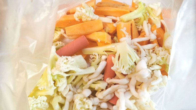 13. 蔬菜类加火腿肠类容易熟的食材放入一个塑料袋