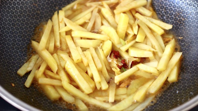 7. 这个时候加入土豆条,大火快速翻炒片刻。