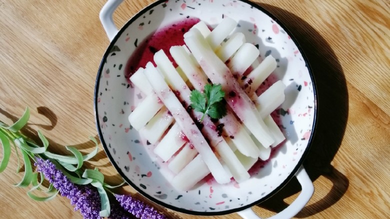 8. 把蓝莓酱根据自己的口味倒在山药上,这道菜就做好。