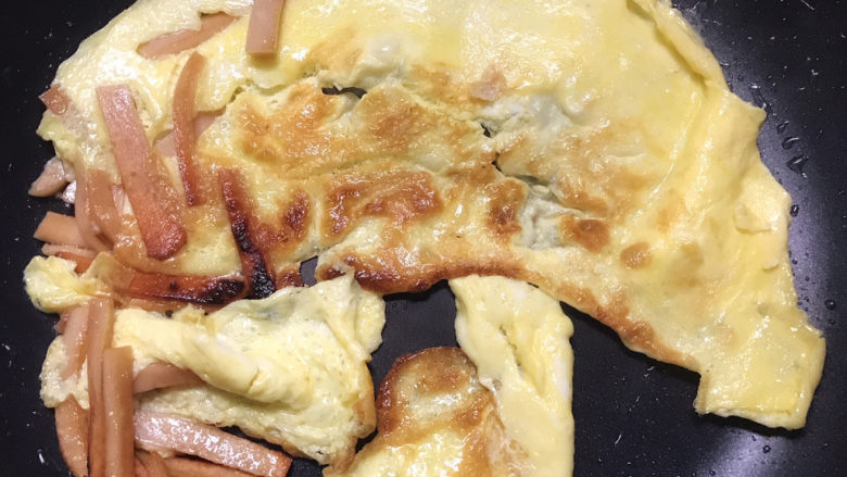 4. 火腿肠炒至金黄后,下鸡蛋液煎到有一点点焦后,盛出备用