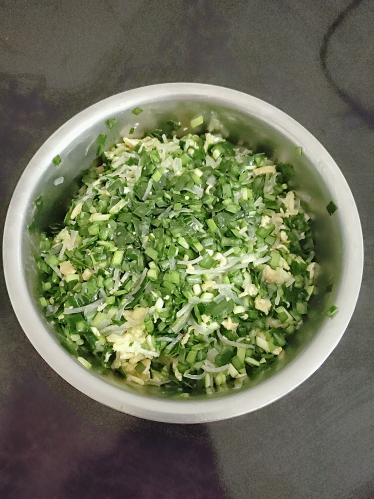 9. 切好的韭菜,凉量的鸡蛋,和粉条都到在一起。