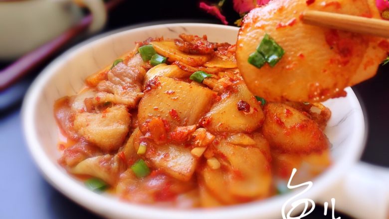 辣白菜是一种朝鲜半岛的风俗发酵美食,特点是辣,脆、酸、甜,色白带红,四季皆宜。白菜含有丰富的粗纤维,不但能起到润肠、促进排毒的作用又刺激肠胃蠕动,促进大便排泄,帮助消化的功能,对预防肠癌有良好作用。 马铃薯的营养成分丰富而齐全,其丰富的维生素C(抗坏血酸)含量远远超过粮食作物;其较高的蛋白质、糖类含量又大大超过一般蔬菜。马铃薯营养齐全,结构合理,尤其是蛋白质分子结构与人体的基本一致,极易被人体吸收利用,其吸收利用率几乎高达100%。