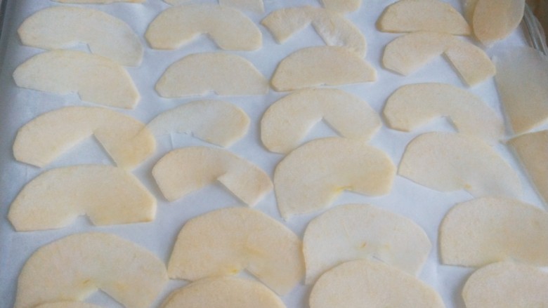 7. 油纸一张铺在烤盘中,把苹果片摆好。
