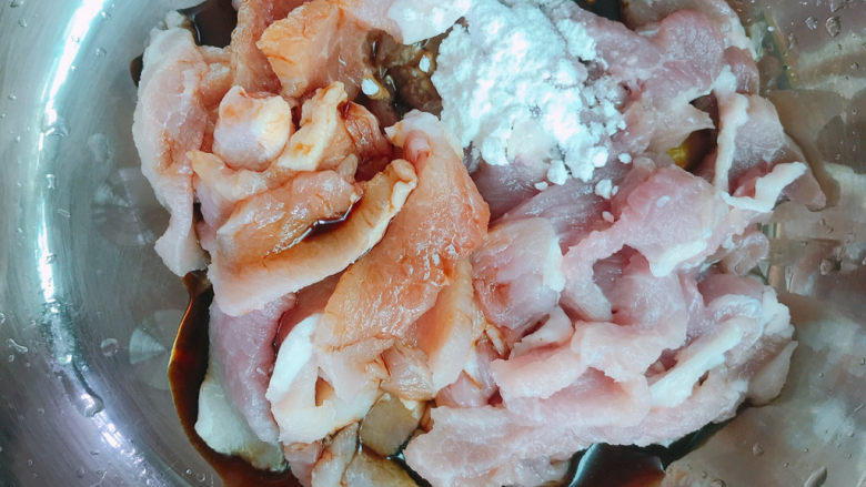 1. 瘦肉切成片,放入玉米淀粉、酱油、黄酒