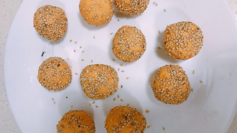 9. 滚完就这样,最好用手压一下炸的时候芝麻不容易掉。