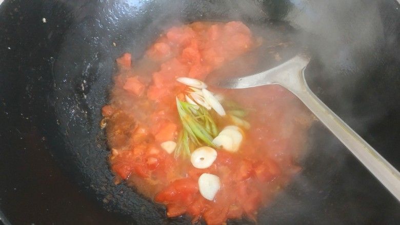 9. 锅中放入适量植物油,倒入西红柿翻炒出红汤