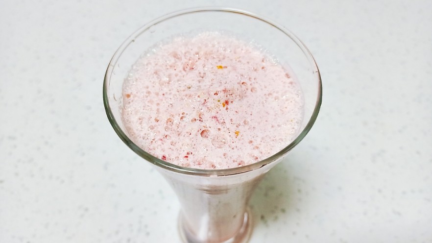 8. 将纯奶倒入隔夜米料理机,放入草莓、圣女果、金桔