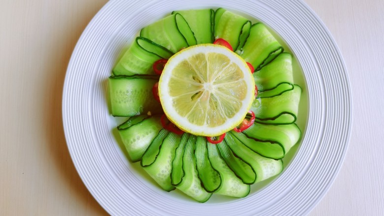 14. 再切少许黄瓜丝和柠檬皮丝,放在柠檬片的上面。