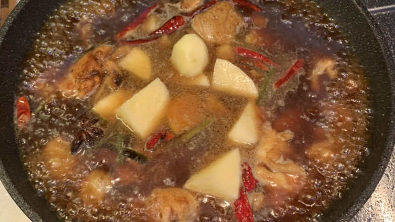 24. 炖到10分钟后,放入红薯粉,再盖上锅盖炖10分钟