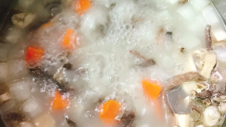 4. 锅中放入适量清水,放入姜片、白萝卜、胡萝卜,大火烧开转小火煮30分钟。
