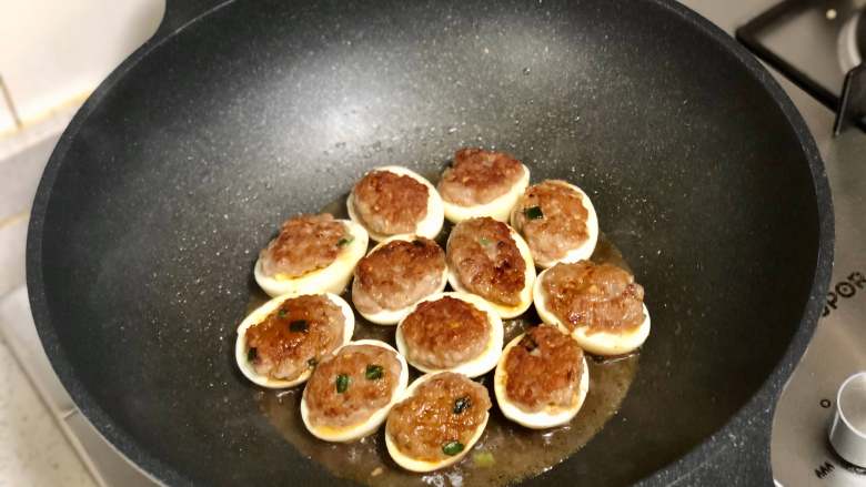 7. 取适量将调好的肉馅盖在鸡蛋上,稍微按压粘紧。