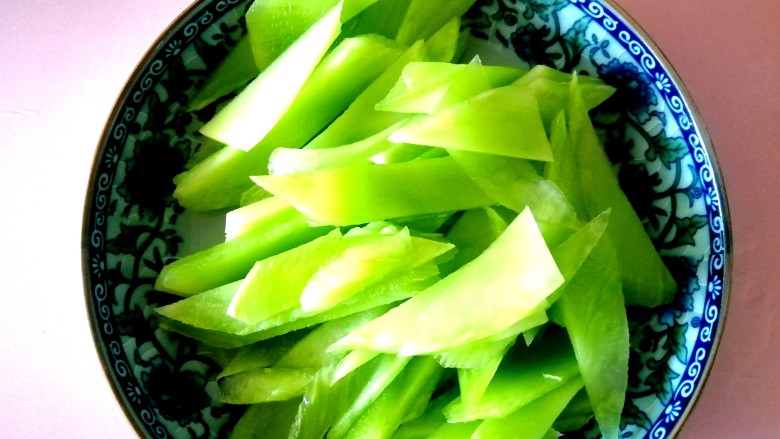 18. 炒熟莴笋后,加入过好油的牛肉翻炒。