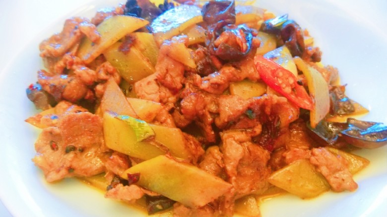 16. 这道步骤没有机会拍照只能说了,锅中倒入适量油烧热,炒香葱姜蒜,加入干辣椒,小米辣,加入豆豉,酱油,倒莴笋木耳炒均匀,倒入牛肉翻炒,加入鸡精炒均匀即可。