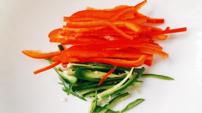 9. 将豆丝,莴笋丝,青红椒丝放入碗中