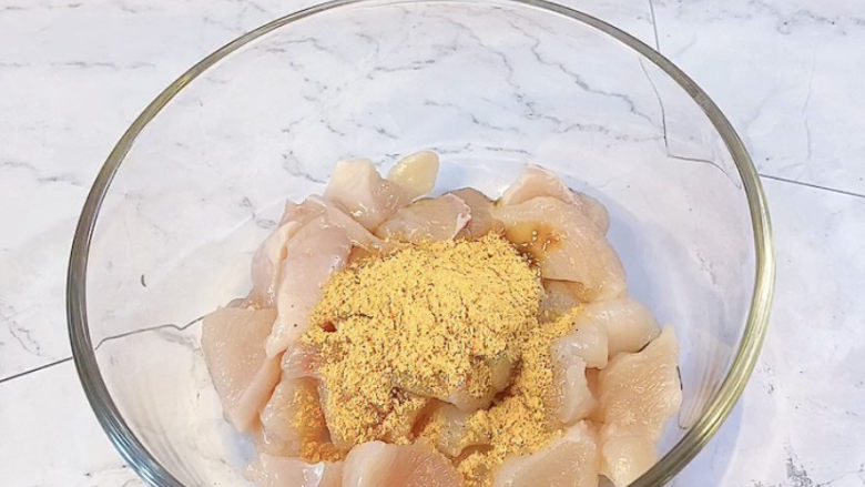 6. 腌好的鸡胸肉先裹上一层淀粉,抖掉多余的粉末