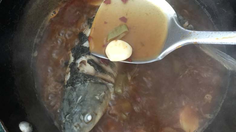 11. 烧开后加盖转小火炖20分钟左右,其中用锅铲把鱼身轻轻铲一铲以防糊底,然后再舀些汤水往鱼背上淋一淋,让其更入味