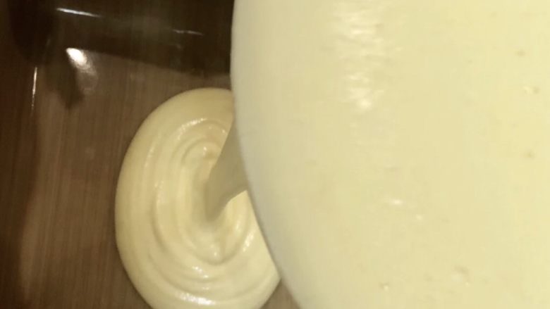 8. 加入蛋黄搅拌后,面糊就会很细腻了,再加两滴香草精去除蛋腥味。