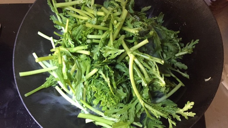 8. 加入泡过水的茼蒿,加入盐,糖,生抽。
