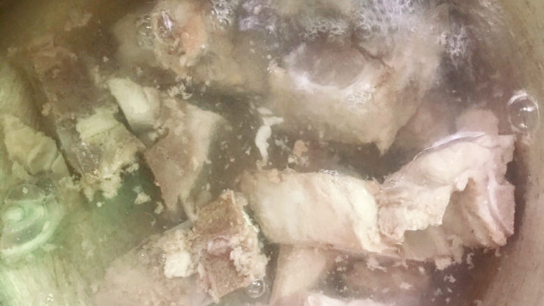 3. 放入锅中加入清水、黄酒烧开后煮3分钟