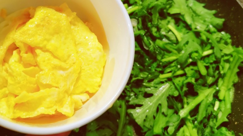 茼蒿菜有一种特殊的香味 富含矿物质 胡萝卜素 膳食纤维 维生素C和挥发油 调节体内水液代谢 消除水肿和鸡蛋一起炒 少盐清香 一人就吃了一盘。