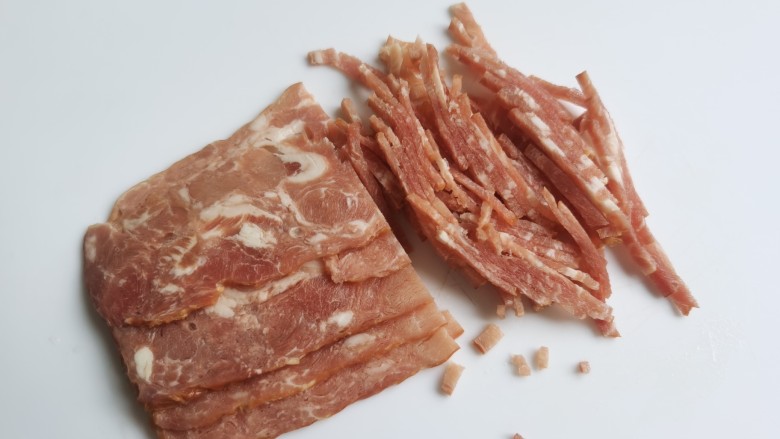 2. 培根切成细丝。不喜欢培根的,可以放些火腿丝。