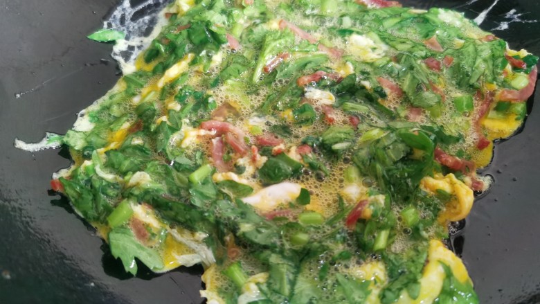 10. 然后把加了茼蒿的蛋液全部倒入锅里。